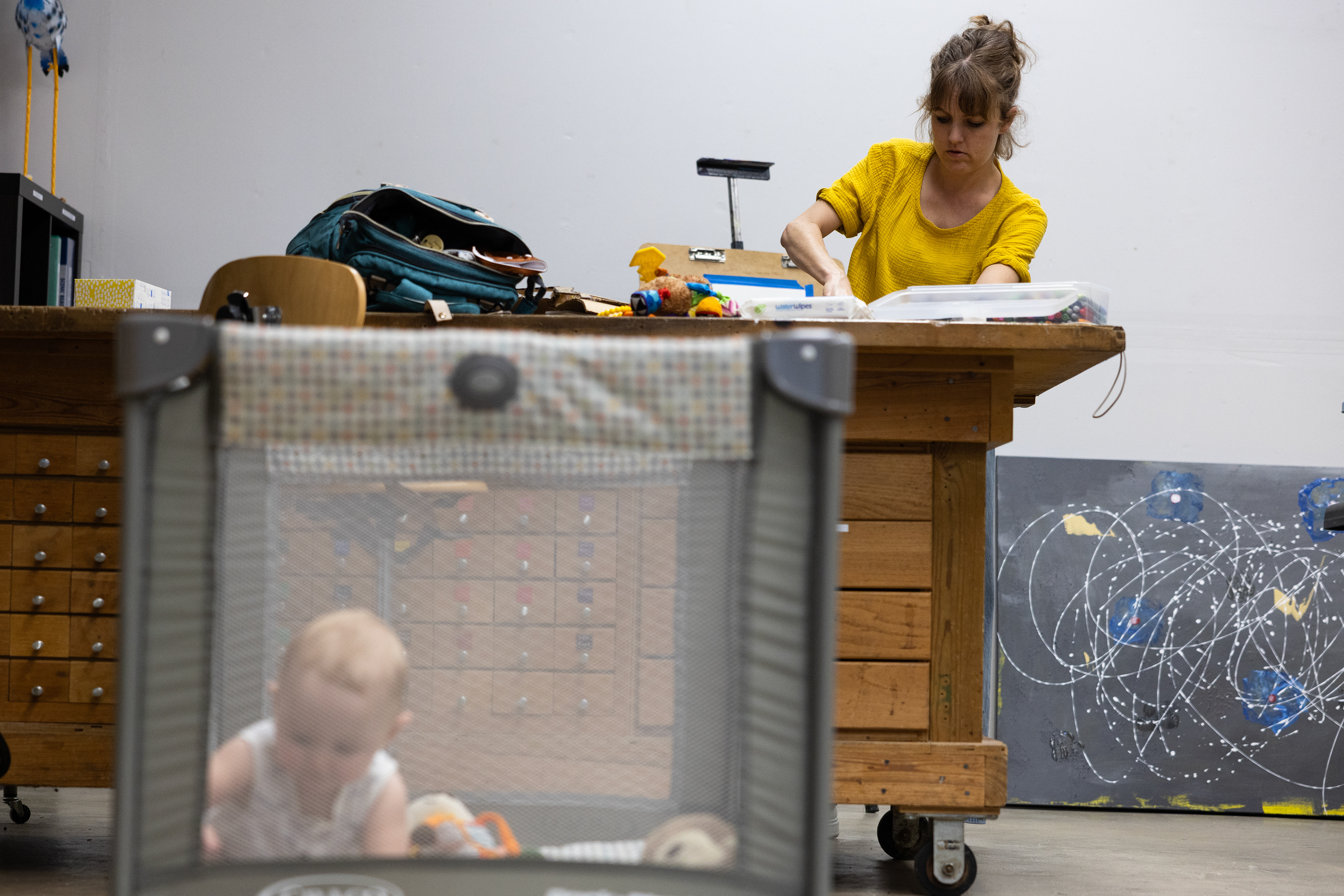 Tara Linn Hunter makes goblin masks while her son plays with toys on Friday, Sept. 27, 2024 in Denton, Texas. Hunter took her con along to many parts of the planning of Cirque du Horror. In the previous year, Hunter was pregnant with her son and was not able to be as involved as she usually was. This year, she could be more involved while taking him along.