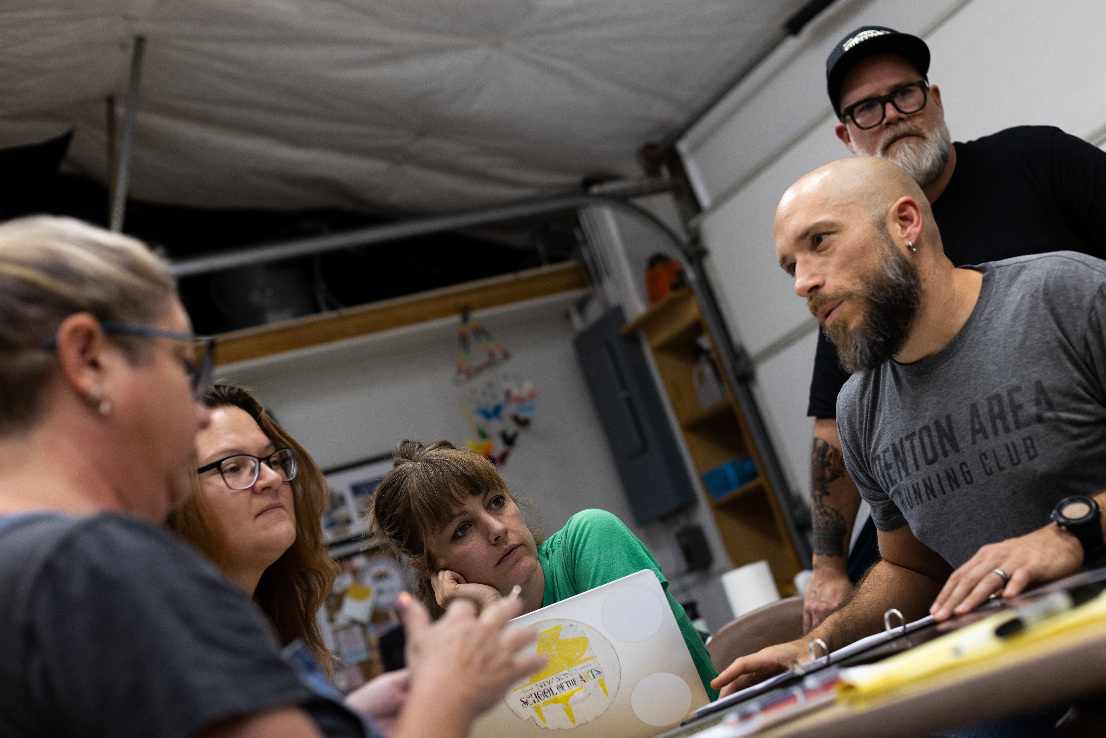 Miranda Stockhausen, Catherine Brunet, Tara Linn Hunter, Chris Taylor and David Pierce discuss early plans for the stage set up of Cirque du Horror on Friday, Aug. 30, 2024, in Denton, Texas. They spent hours discussing the layout of this years stage and the addition of more virtual stage props. With the help of Joel Olivas, they decided to use projections to add another element to the production and were able to create more in depth scenes. The group talked through the whole show with Olivas to go over each scene in depth and the descriptions of what visuals they wanted.