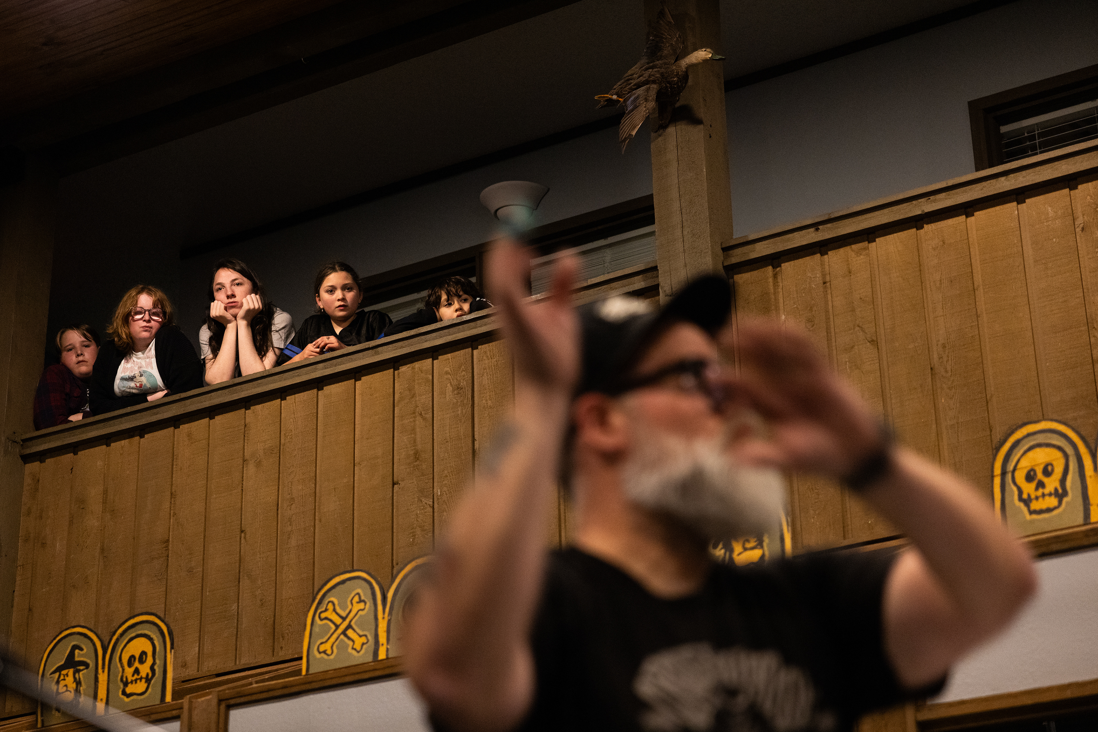 Five days before opening night, children of the cast and crew of Cirque du Horror watch David Pierce lead orchestra rehersals at Little Guy Movers on Sunday, Oct. 20, 2024, in Denton, Texas. Throughout these months of preparations, many of the cildren have been present for prop making, rehersals and shows. Jonah, Pierce's son, is on the far right. In Pierce's office reads a note, "Get up every morning, every day or night, and work. Teach Jonah (his son) the meaning of following your dreams, hard work and never giving up."